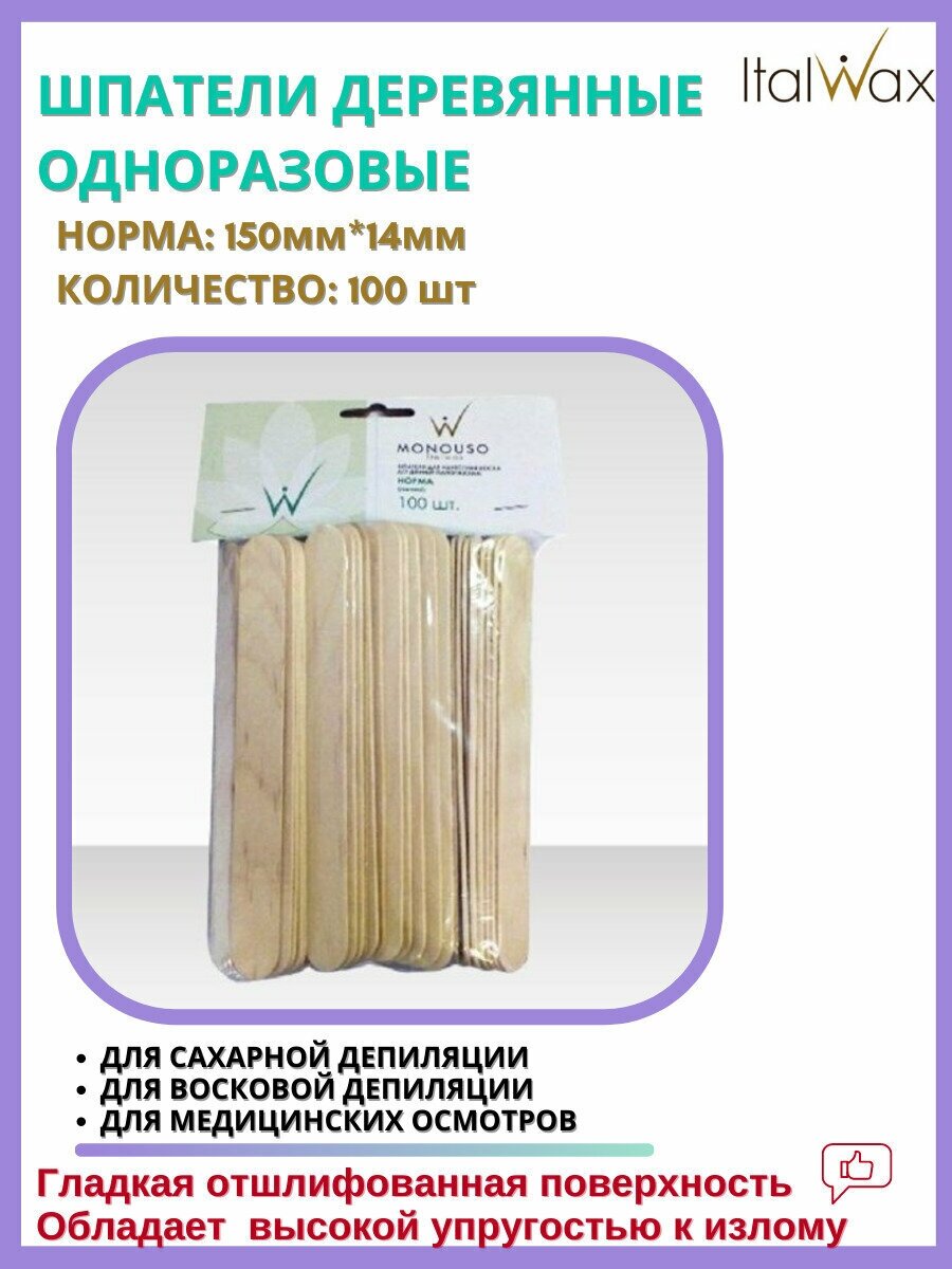 Italwax Деревянные одноразовые шпатели для нанесения воска и сахарной пасты для депиляции "Норма" (16,6х15 см) 100 шт., Италия