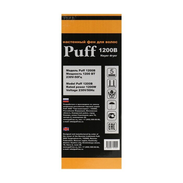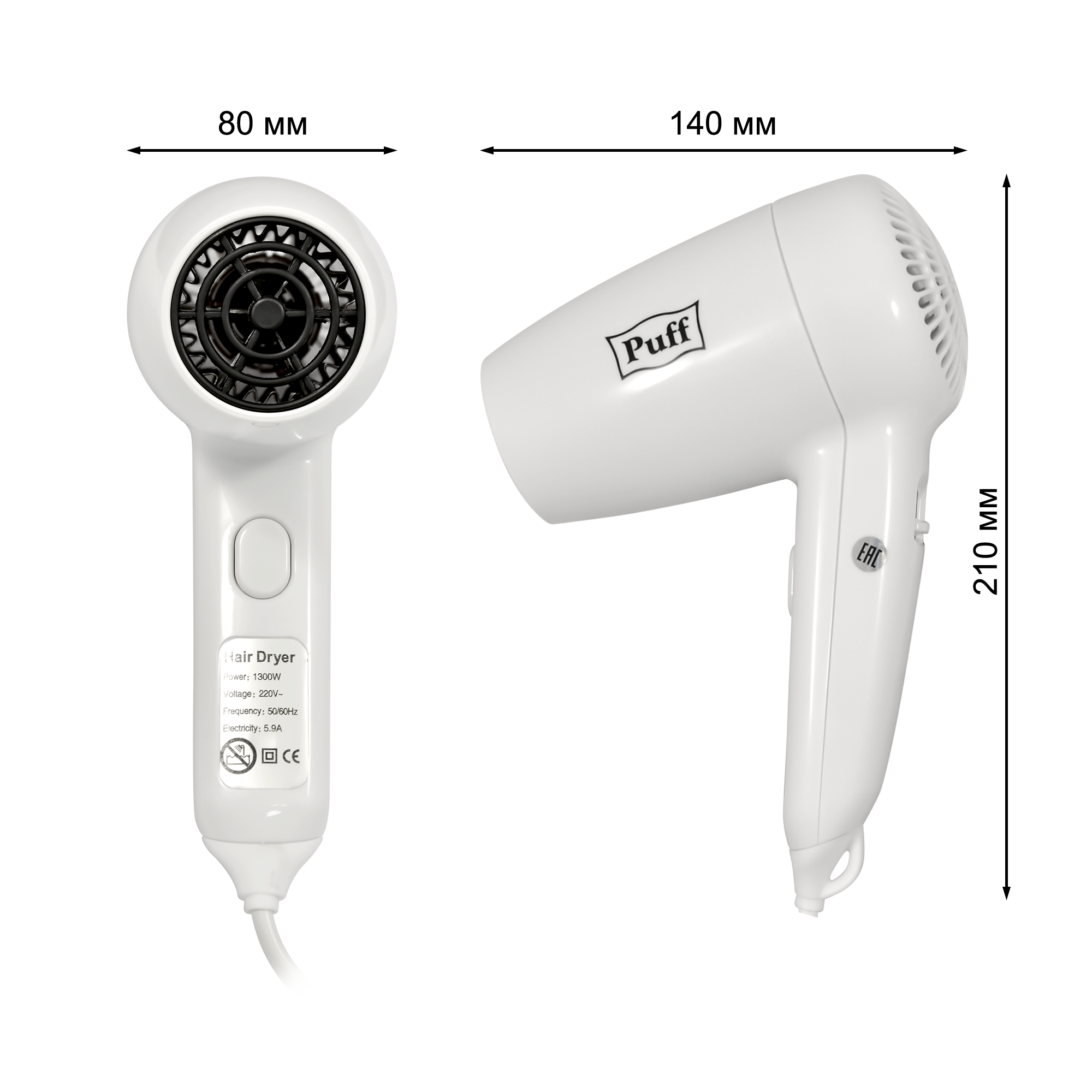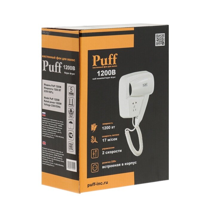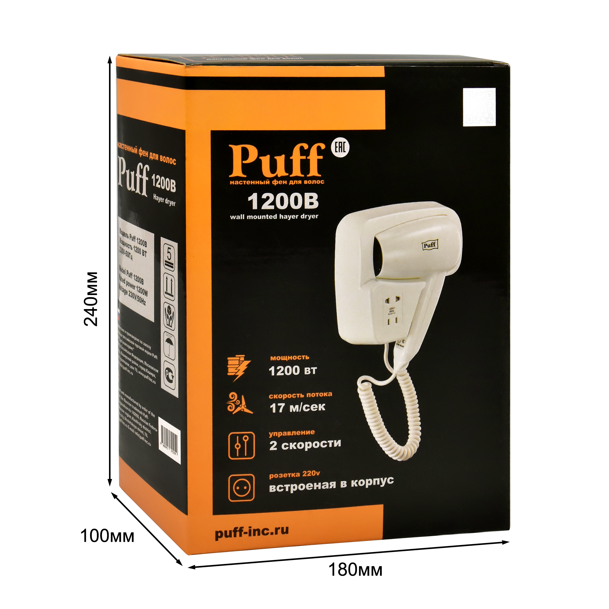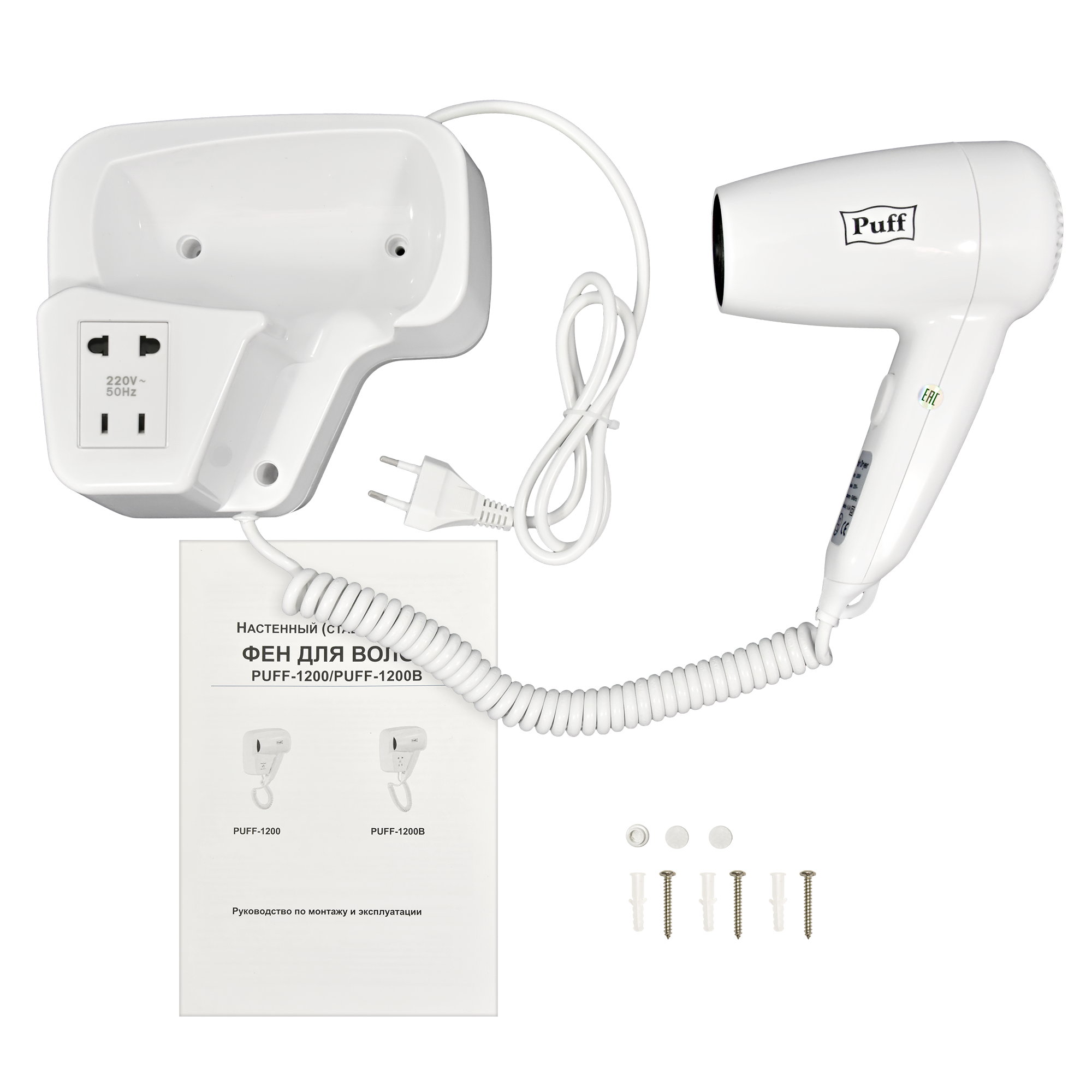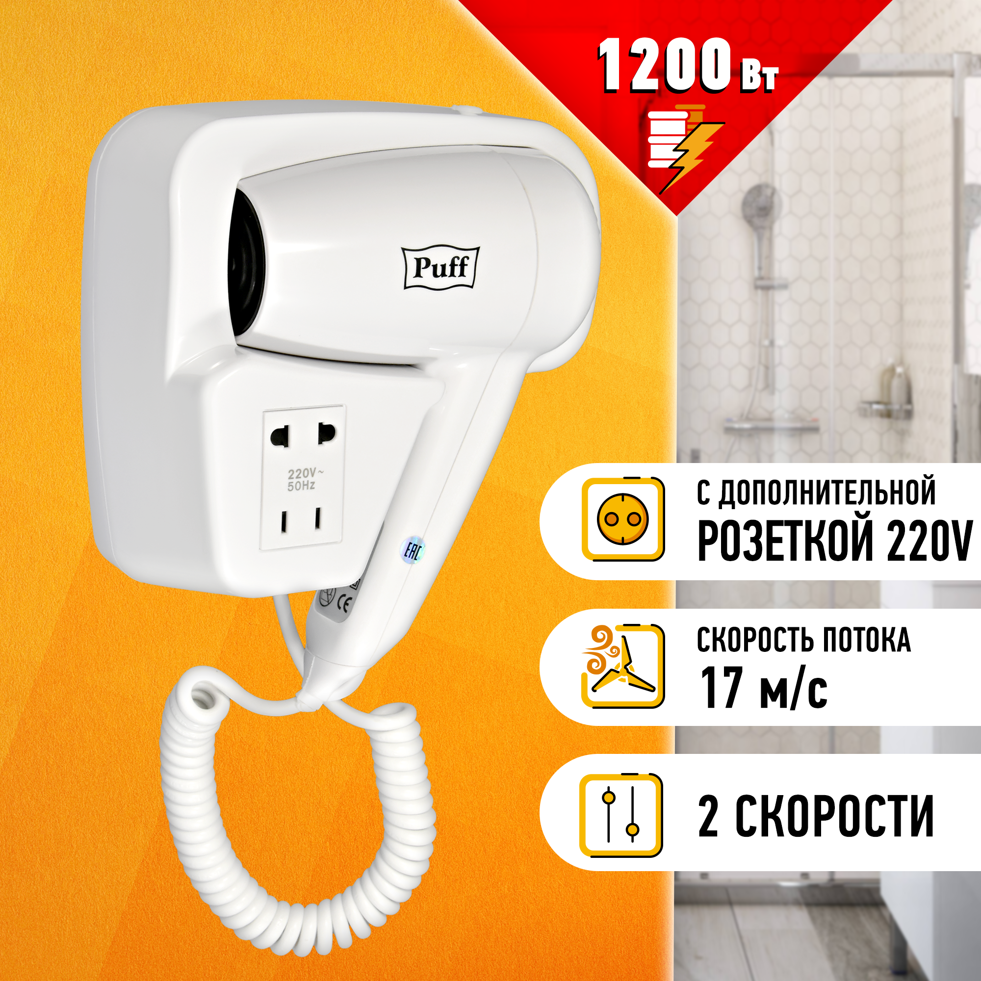 Фен Puff-1200B, настенный, 1200 Вт, с розеткой, белый Puff 6879571 .