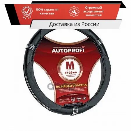 Оплётка руля AUTOPROFI AP-150 BK/BK, натуральная кожа/ вставки из экокожи, хромированные кольца чёрый, разм. М,