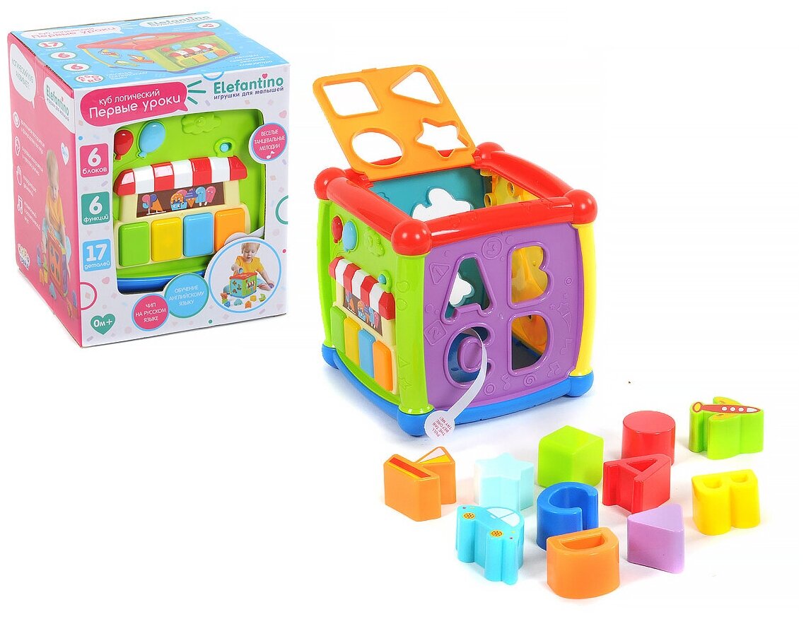 Куб логический "Elefantino" на бат. 6 функций: сортеры с фигурками, шестеренки, зеркальце, пианино, часики, обуч. анг.яз. мелодии, в/к 15,8*15,8*19 см IT104394