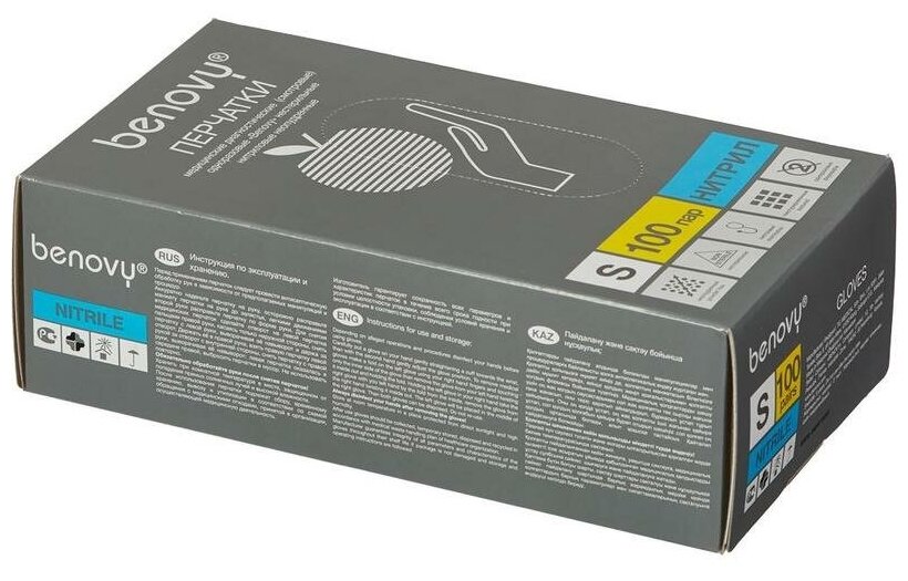 Перчатки медицинские Benovy, нитрил, нестерильные, белые, размер S, 100 шт