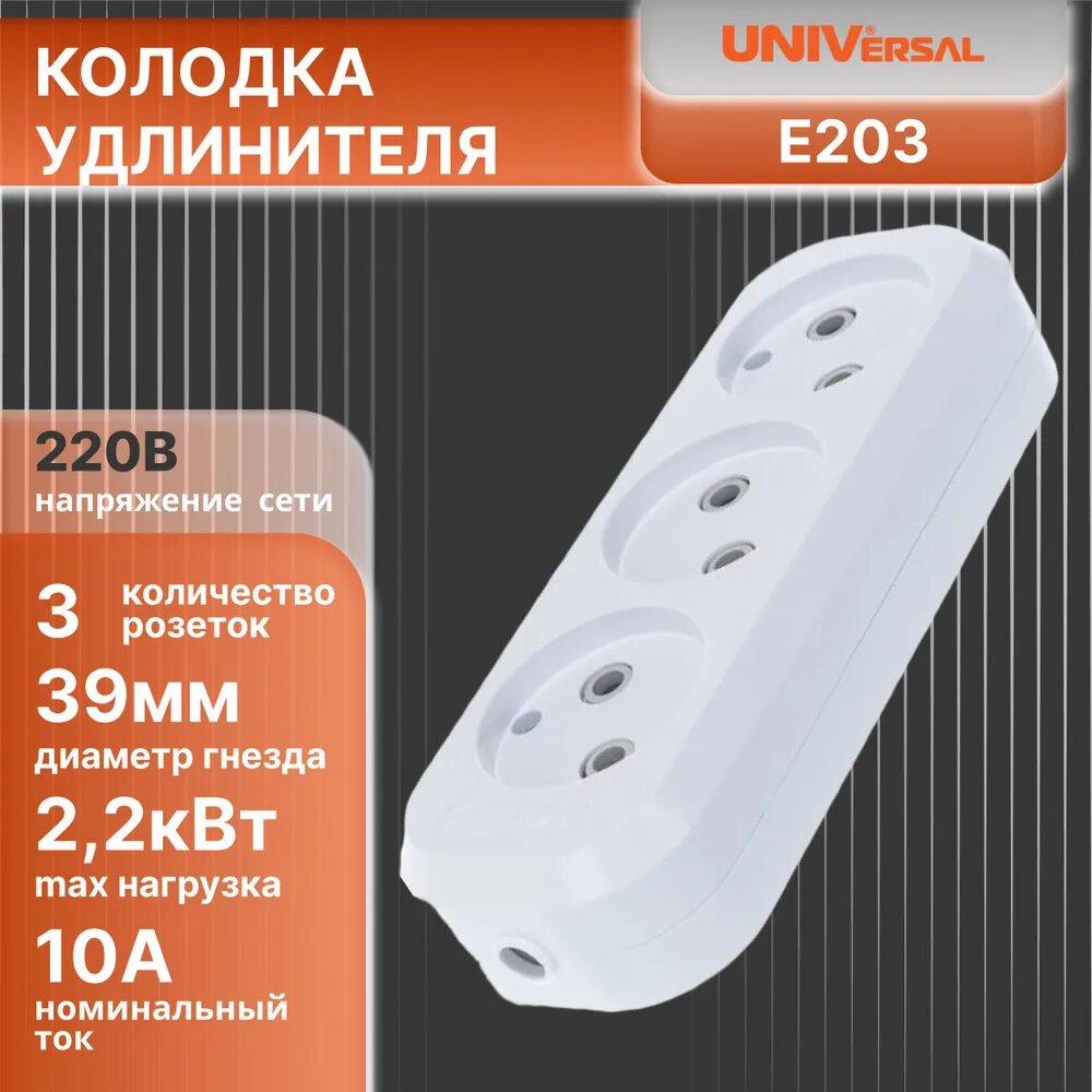 Колодка удлинителя Universal АБС-пластик 3 гнезда без заземления 220В E203