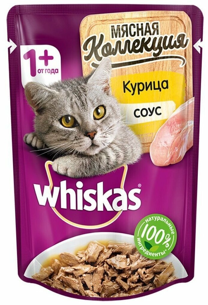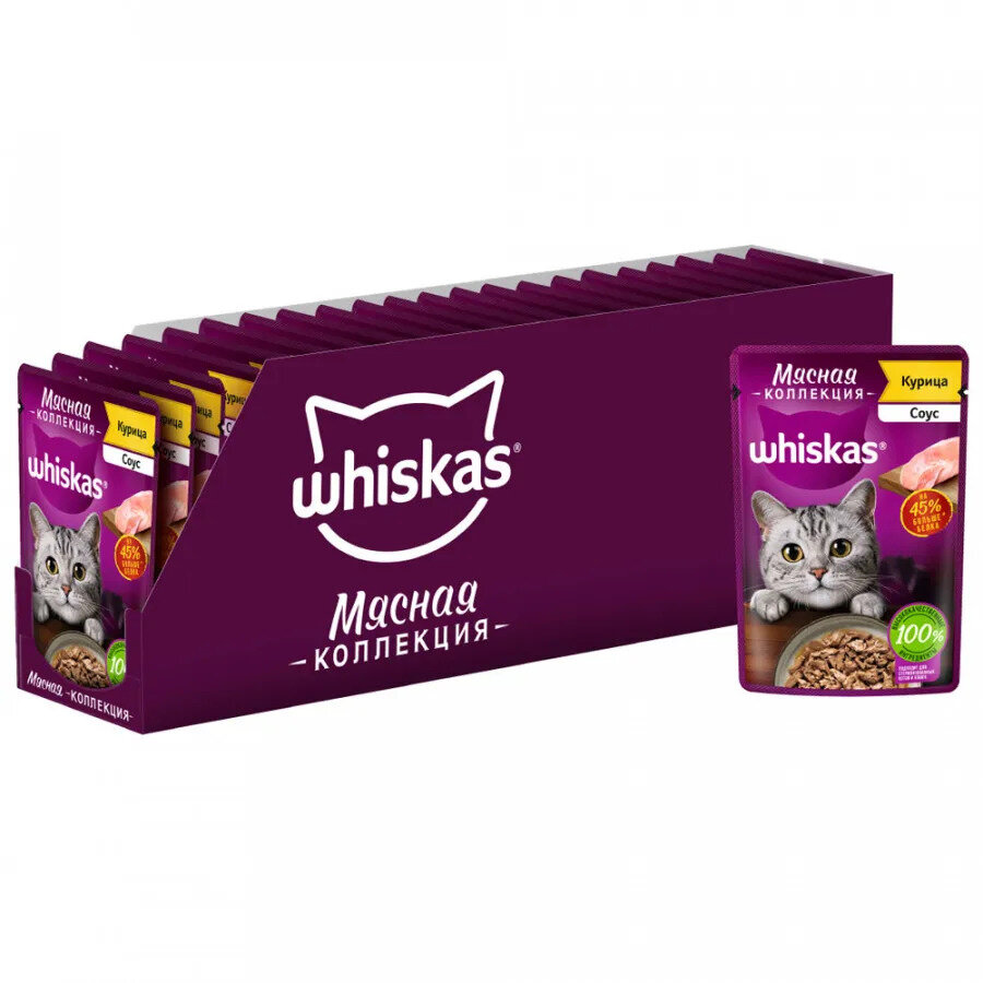 Купить Whiskas влажный корм для кошек, мясная коллекция, курица в соусе (28шт в уп) 75 гр