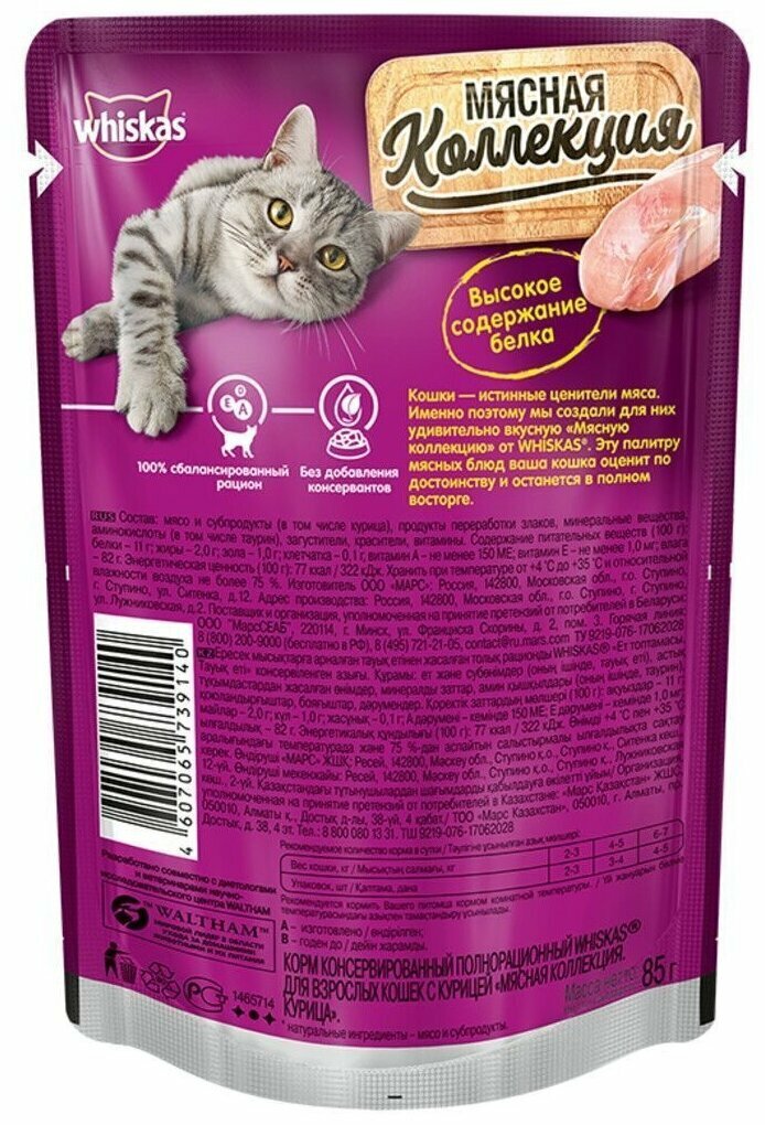 СохранитьWhiskas влажный корм для кошек, мясная коллекция, курица в соусе (28шт в уп) 75 гр интересное: