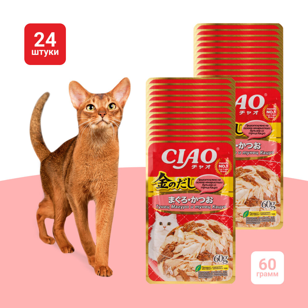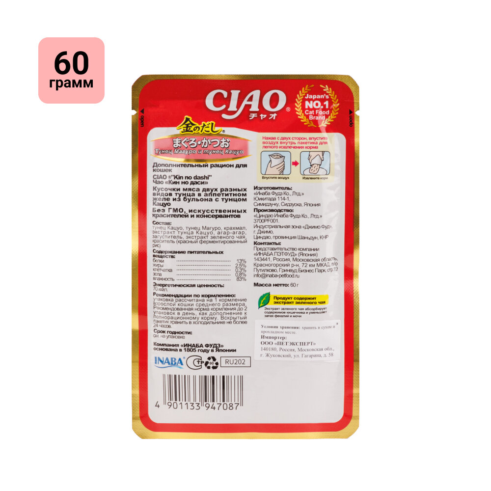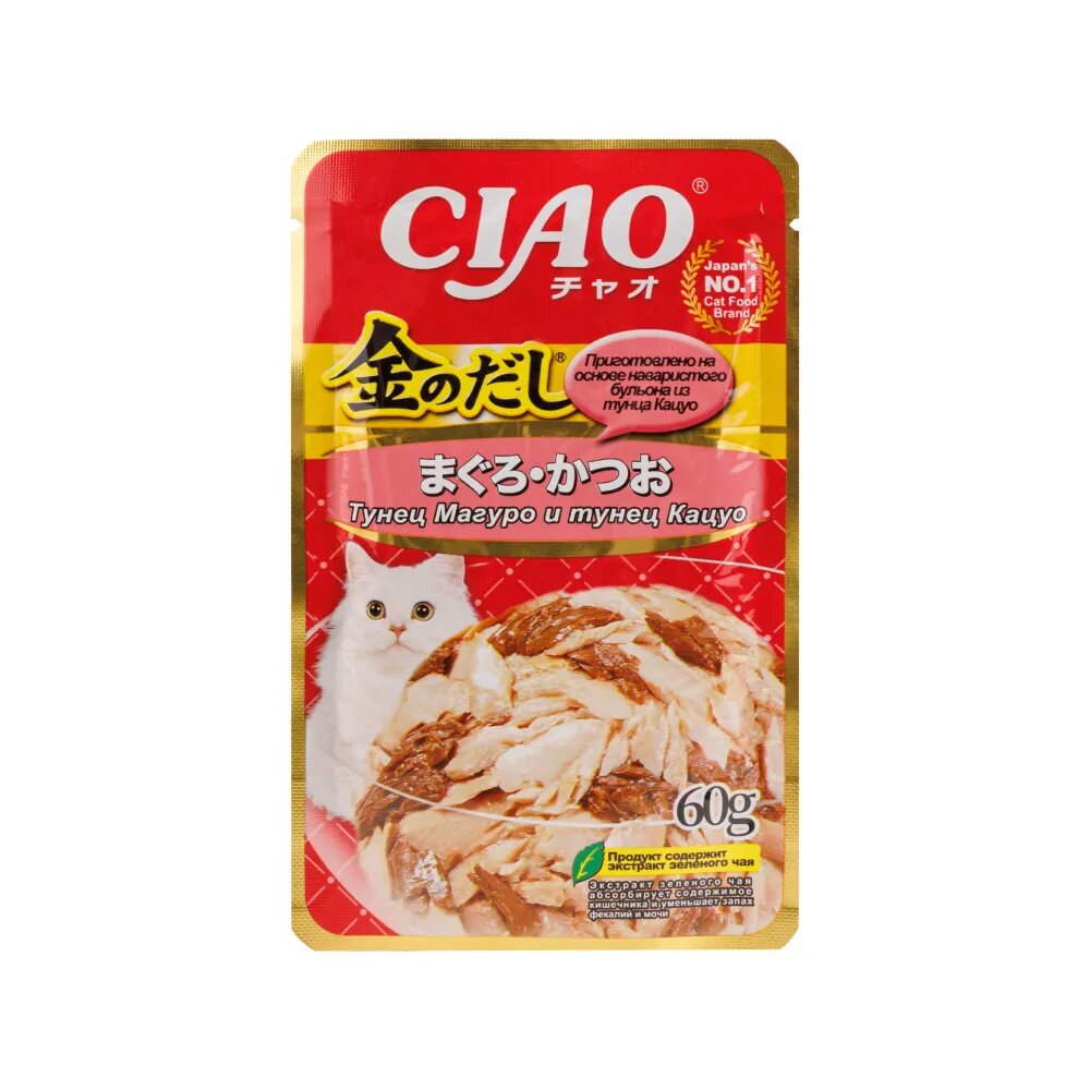 Влажный корм для кошек Inaba Kinnodashi, с тихоокеанским тунцом и тунцом бонито, паучи, 12шт х 60 гр