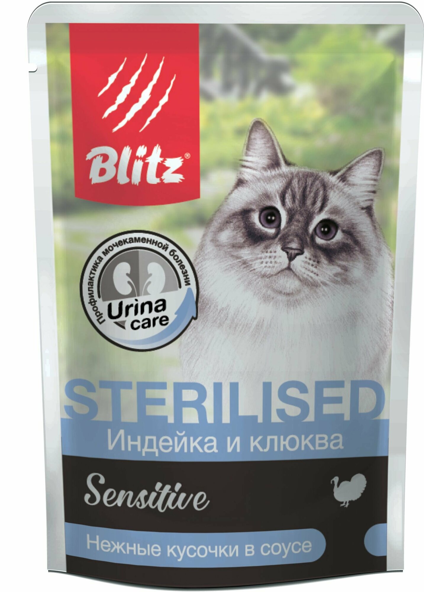 #(C)Блиц 80955 Sensitive Sterilised пауч для стерилизованных кошек и кастрированных котов кусочки в соусе Индейка с клюквой 85г 20%