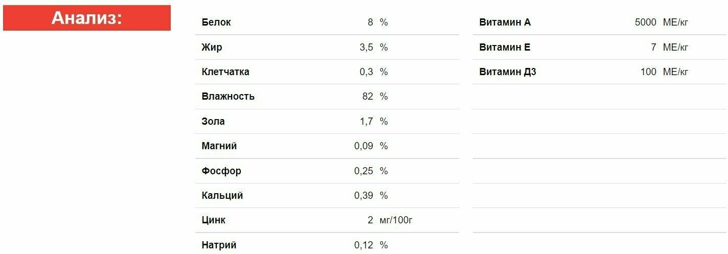 | Плюсы: | Корм был доставлен вовремя, хорошо упакованным. На мой взгляд, корм неплохой. Состав натуральный, судя по описанию. Имеет приятный запах субпродуктов, мягкие кусочки, которые кошке легко жевать,небольшое количество бульона. Кошка ест с удовольствием. Стул в норме, ш?рстка блестит. |