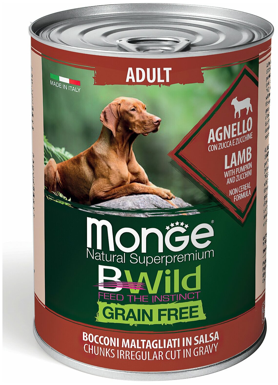 Купить Monge BWild GRAIN FREE беззерновые консервы из ягненка с тыквой и кабачками для взрослых собак всех пород 400 г