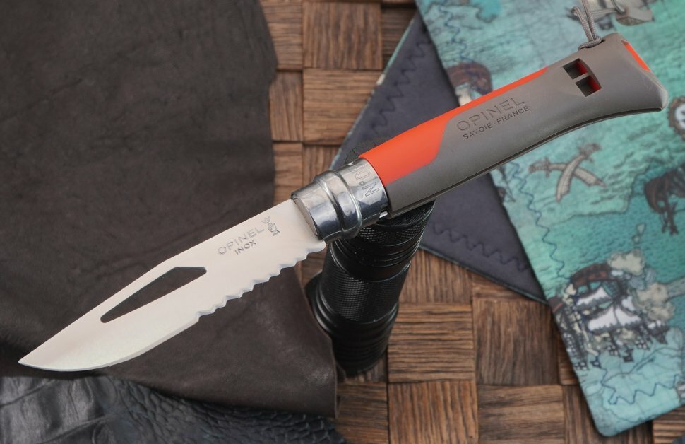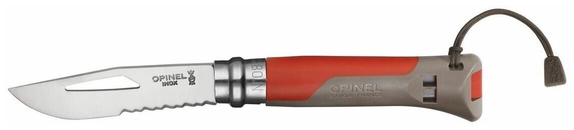 Нож Opinel серии Specialists Outdoor №08, клинок 8,5см, нерж.сталь, пластик, свисток, темляк, красный/серый