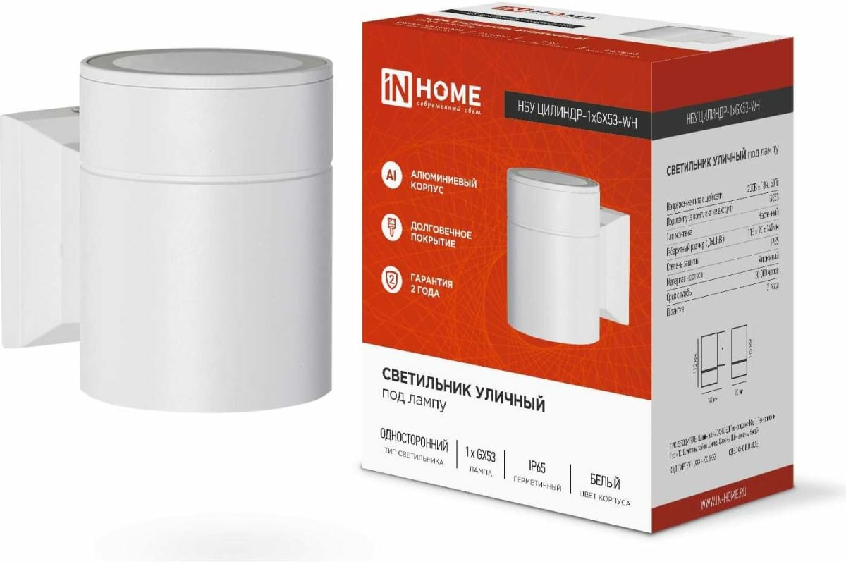 IN HOME 4690612023502 Светильник НБУ ЦИЛИНДР-1xGX53-WH 16Вт IP65 230В уличный настенный односторонний алюм. под лампу 1хGX53 бел. IN HOME 4690612023502