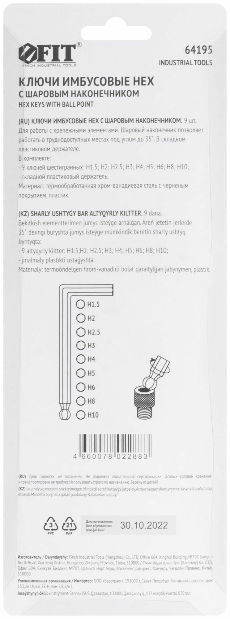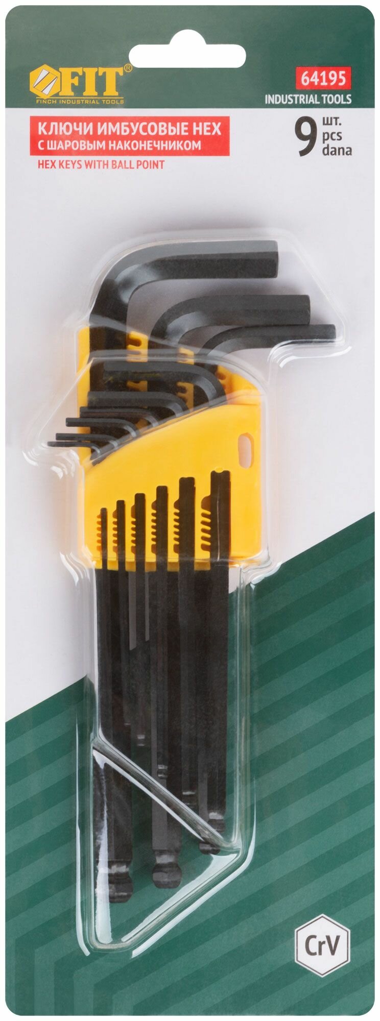 Ключи шестигранные CrV средние с шаром (1.5-10 мм) 9 шт | код. 64195 | FIT ( 1шт. )