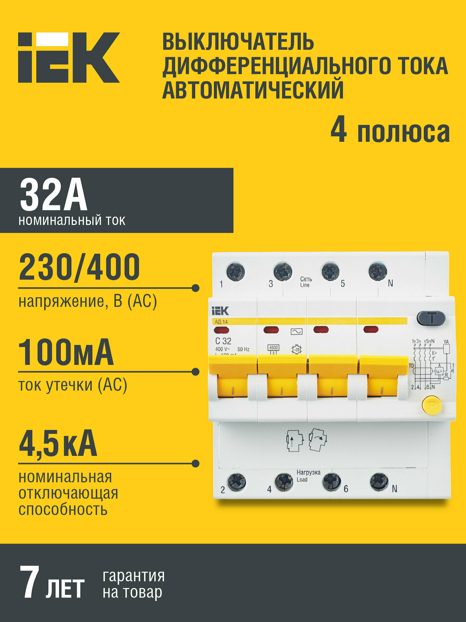 Дифференциальный автомат IEK АД14 4Р 32 А 100 мА