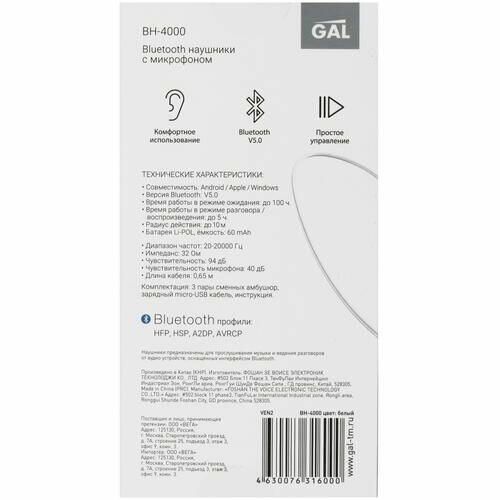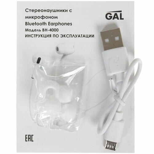 Bluetooth наушники вкладыши с микрофоном GAL BH-4000, беспроводная мобильная гарнитура, белые интересное: