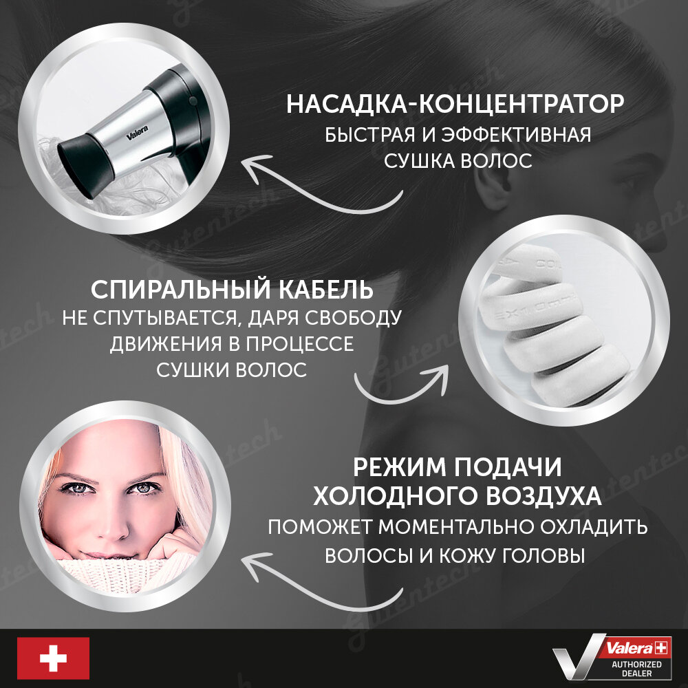 Фен Valera Hospitality Action 1800 Push (542.14 black/chrome), мощность 1800 Вт, регулировка температуры, холодный воздух, концентратор, профессиональный спиральный шнур