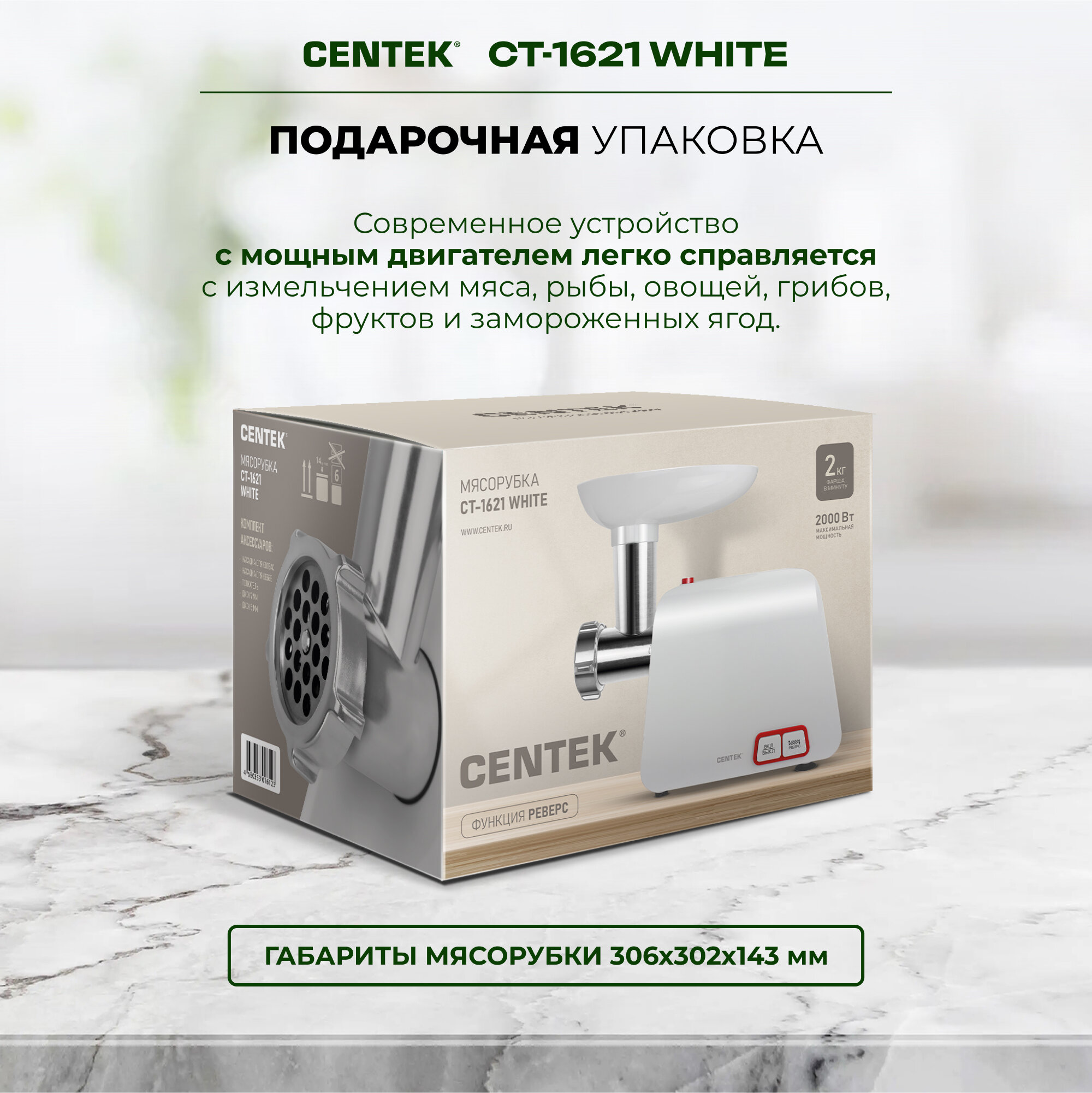 Мясорубка электрическая CENTEK CT-1621 - (Белый) 2000 Bт, 1.5кг/мин, стальной коннектор, 2 диска, 2 насадки