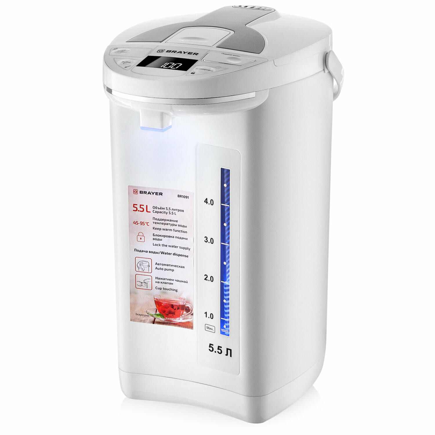 Термопот BRAYER BR1091WH, 1450 Вт, 5,5 л, 2 спос.подач.воды, LCD-дисп, поддерж.темпер,блокировка