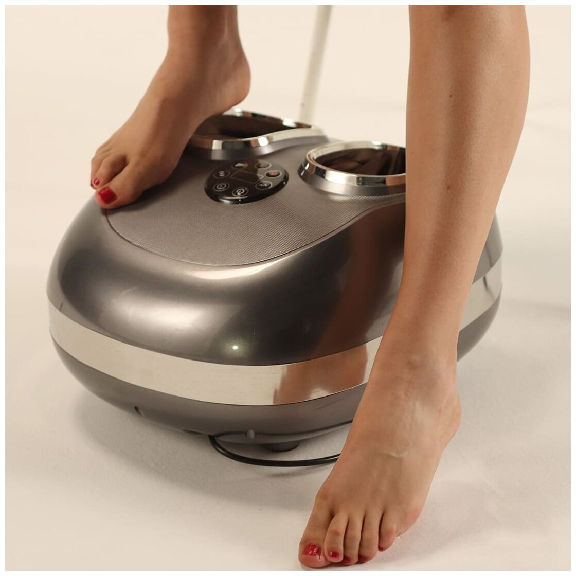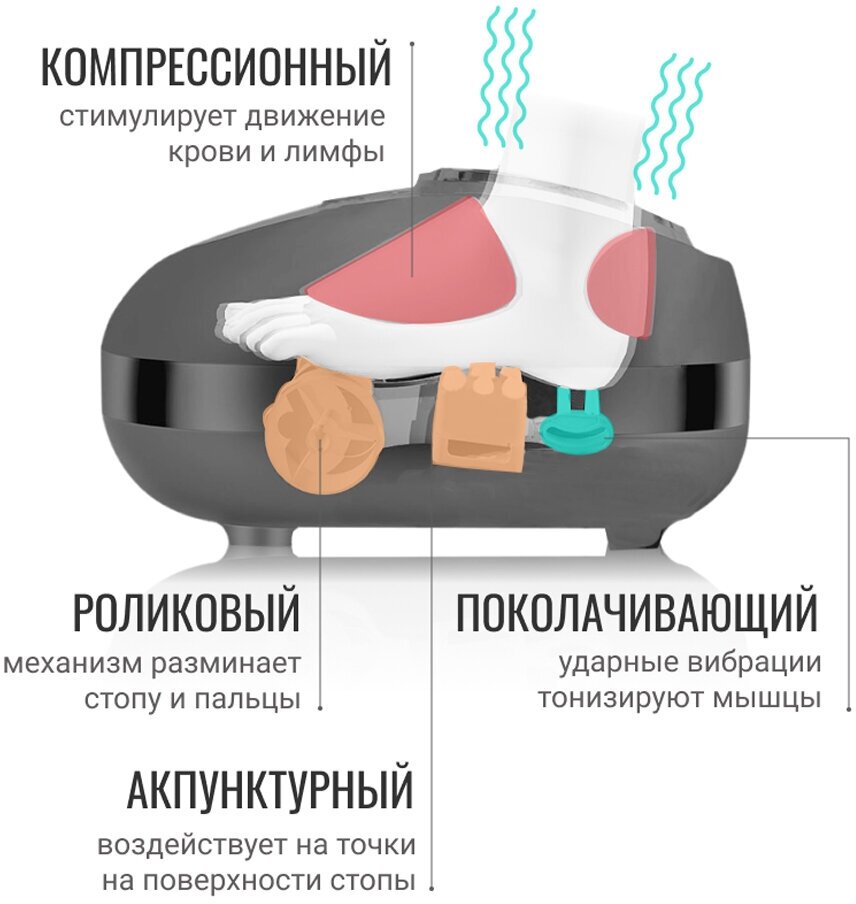 | Дополнительная информация | у массажера 4 автоматические программы массажа, автотаймер на 20 минут по умолчанию (настройка от 5 до 30 минут); виды массажа: 1) роликовый+акупунктурный, 2) воздушно-компрессионный, 3) поколачивающий, 4) комбинированный; у массажера 2 уровня нагрева - сильный и слабый, при желании эту функцию можно отключить; 4 уровня давления воздуха, данная функция доступна во всех режимах; есть встроенная технология очистки воздуха, которая эффективно и быстро освежает ноги во время массажа; панель управления располагается прямо на корпусе, на дисплее отображаются программы и таймер; на любой размер ноги (до 46) |