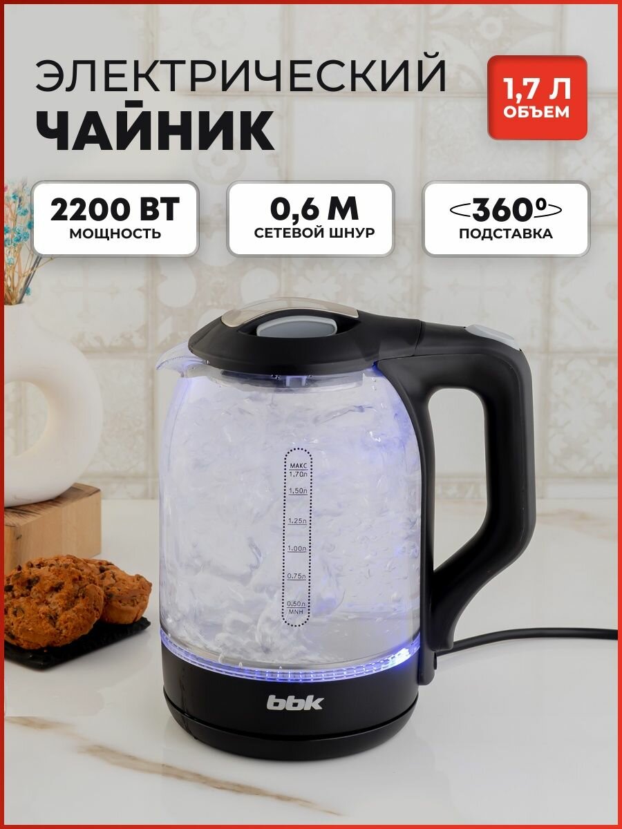 Чайник стекло 1,7л BBK, 2200Вт, черный, арт. EK1724G