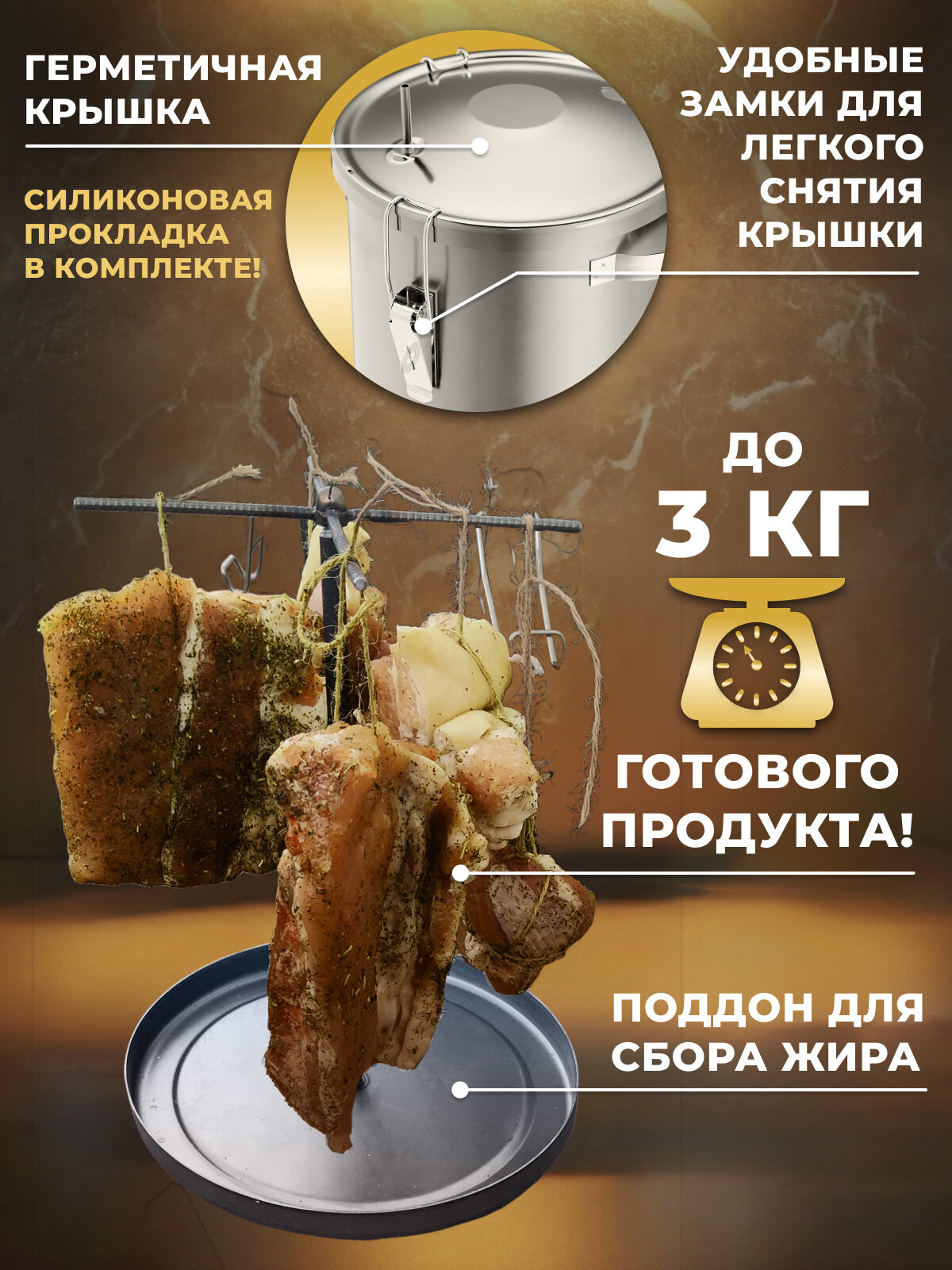| Плюсы: | Размер удобный для копчения небольшого количества рыбы или мяса в квартире |