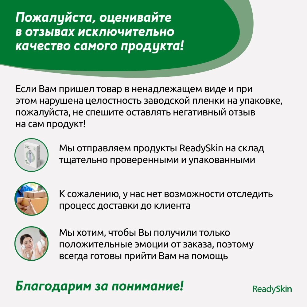 | Отзыв: | Давно хотела приобрести этот полезный аппарат. У меня довольно проблемная кожа и по утрам бывают отёки, но благодаря ReadySkin я забыла об этой проблеме. Сам прибор компактный и лёгкий, я часто беру его с собой и он не занимает много места. ReadySkin хорошо сужает поры и после него кожа выглядит ухоженной. Я очень довольна покупкой, теперь моя кожа стала выглядить намного лучше! |