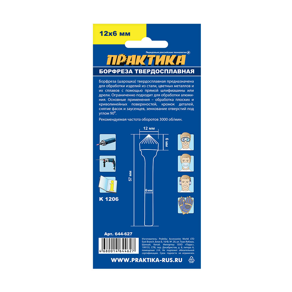 Ниже Вы можете прочитать отзывы на Борфреза по металлу твердосплавная тип K зенкер 90 град, 12 х 6 мм, хвостовик 6 мм ПРАКТИКА 644-627, ознакомится с подробными характеристиками, посмотреть интересные обзоры и фотографии на Борфреза по металлу твердосплавная тип K зенкер 90 град, 12 х 6 мм, хвостовик 6 мм ПРАКТИКА 644-627.