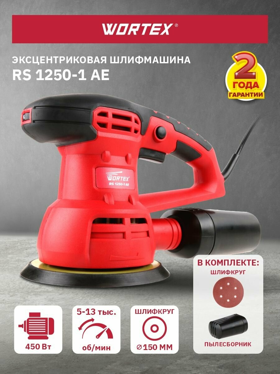 Эксцентриковая шлифмашина WORTEX RS 1250-1 AE в кор. 450 Вт, 150 мм, 5000-13000 об/мин (Амплитуда колебаний 2 мм, регул. об.) (RS12501AE01319)