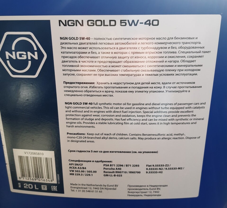 Моторное масло синтетическое, турбо NGN GOLD 5W 40 20л NGN V172085810 MF8S765 X6 VPBK1 1436726801 NGN V172085810