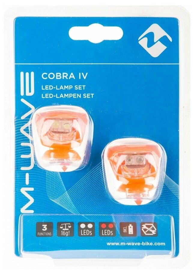 Фонарики велосипедные M-WAVE COBRA IV, комплект, по 2 диода, 3 режима, оранжевый корпус, 5-220637
