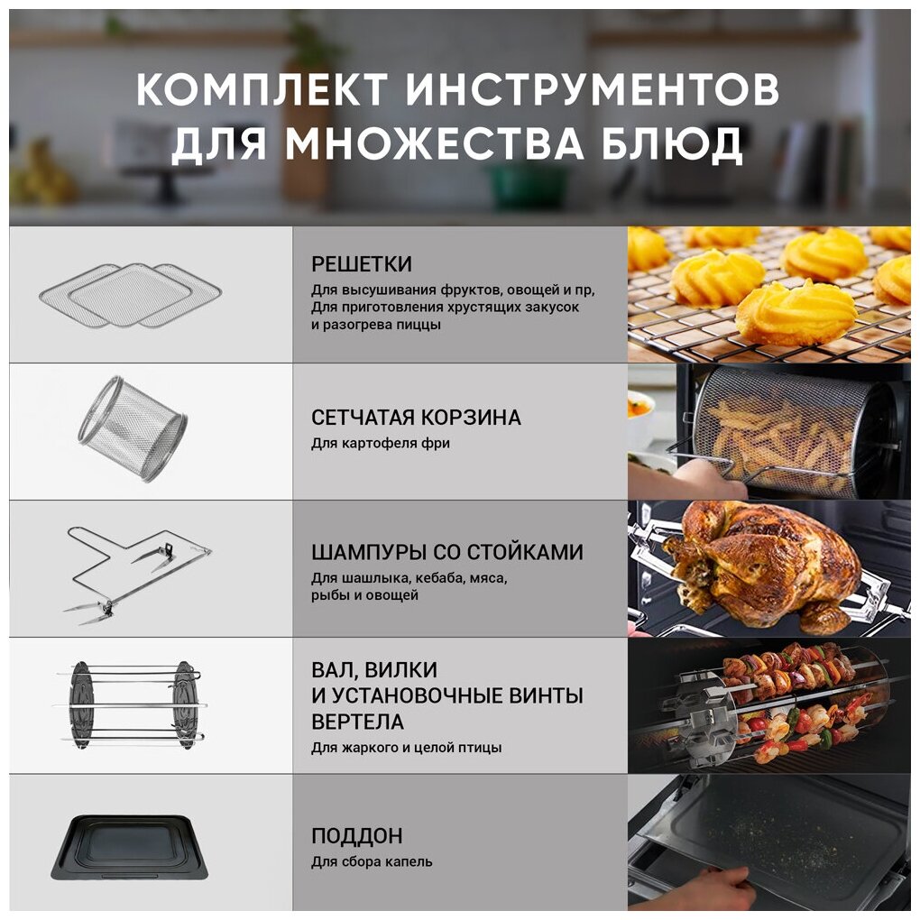 Много режимов, до 200 градусов жарит дисплей удобный нормальная комплектация . и корзина , вал , поддон - все это есть. фри жарить или курочку - супер)) бутики тоже. |