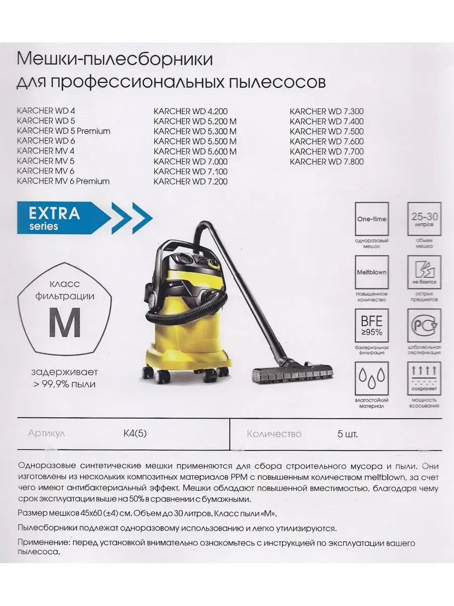 Одноразовые мешки для пылесоса KARCHER WD 4, WD 5, WD 6 ROCKSTAR K4 (комплект 5 шт интересное: