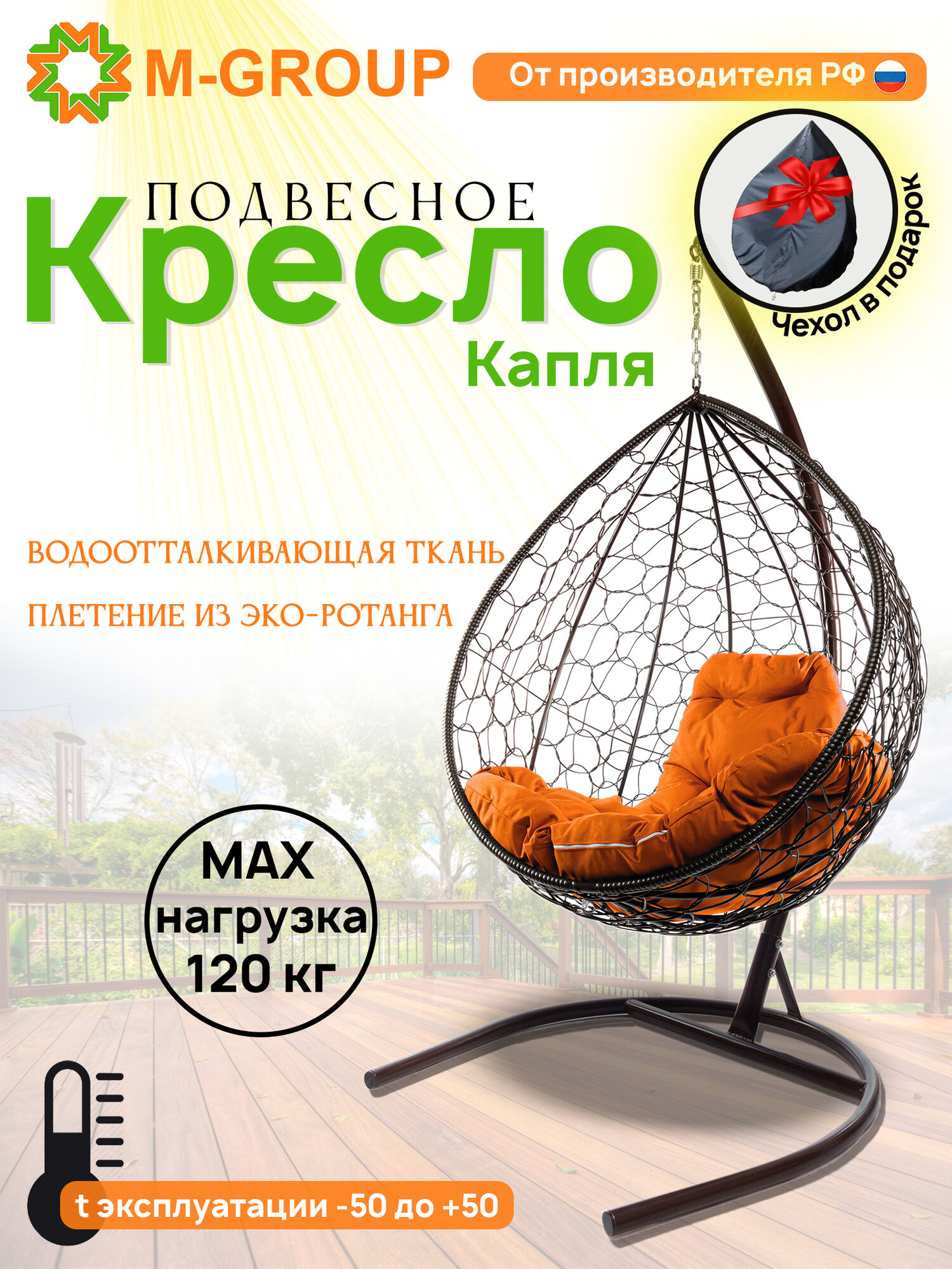 Купить Подвесное кресло кокон M-group капля с ротангом коричневое+оранжевая подушка