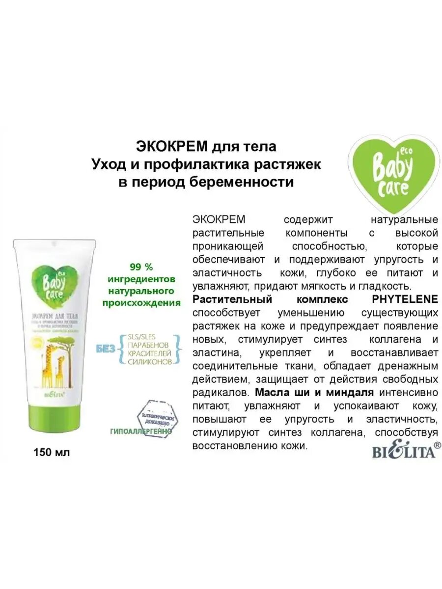 Baby care экокрем для тела уход и профилактика растяжек в период беременности