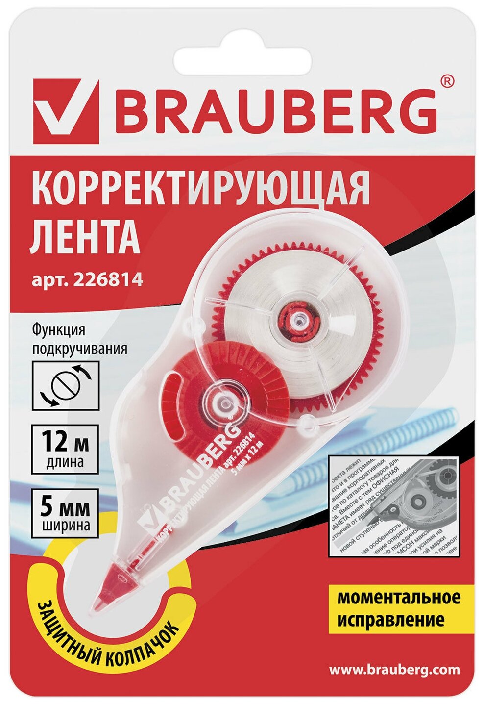 Корректирующая лента BRAUBERG 5 мм х 12 м, корпус прозрачный, механизм перемотки, блистер, 226814