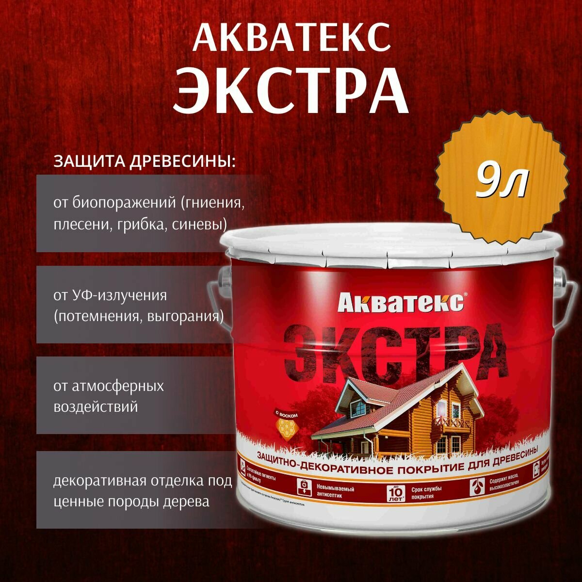 Защитно-декоративное покрытие для дерева акватекс экстра алкидное, полуглянцевое, рябина 9л