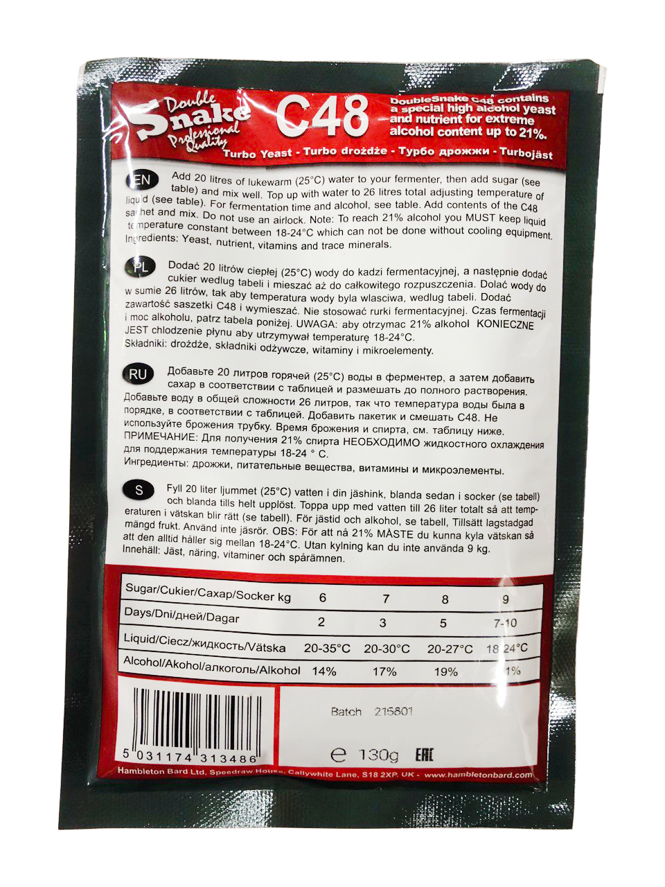 Дрожжи Double Snake C48 (Дабл снейк С48, спиртовые турбо дрожжи), 1 штук по 130 гр