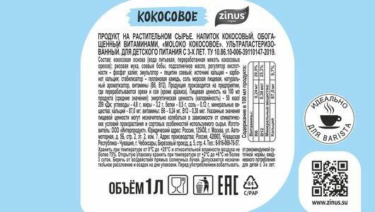 Продукт на растительном сырье . Напиток кокосовый, обог. вит., "ZINUS BARISTA" "MOLOKO кокосовое". Ультрапастеризованный. 1Л/ТВА