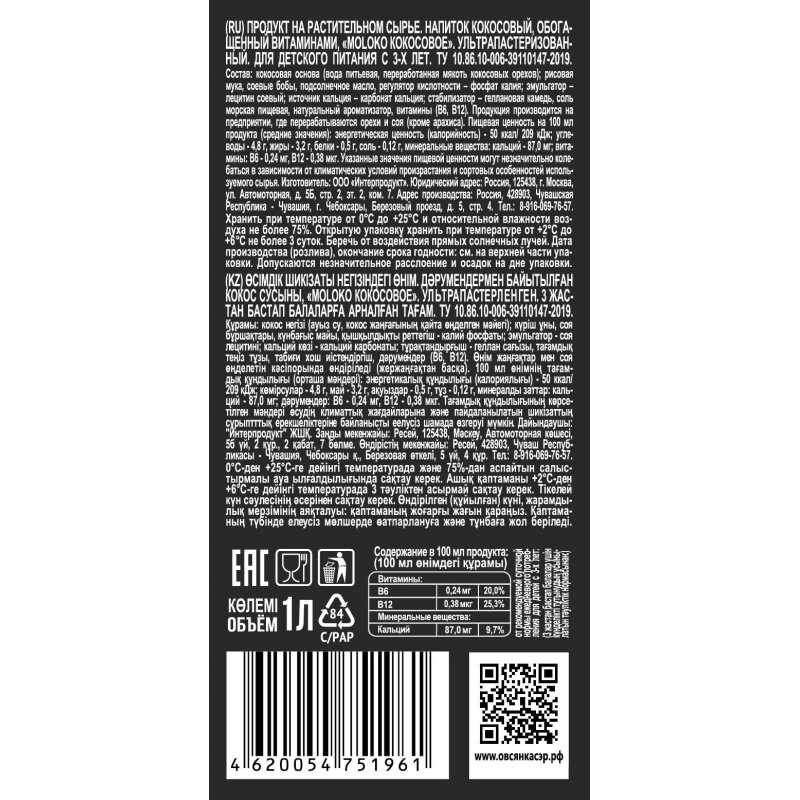 | Состав | вода, кокосовое молочко (7,5%) (кокосовые сливки, вода); рис, соевые бобы, кокосовое масло, морская соль, стабилизаторы: геллановая камедь, фосфат кальция; эмульгатор: лецитин подсолнечный; натуральный ароматизатор, витаминный комплекс (В6, В12) |