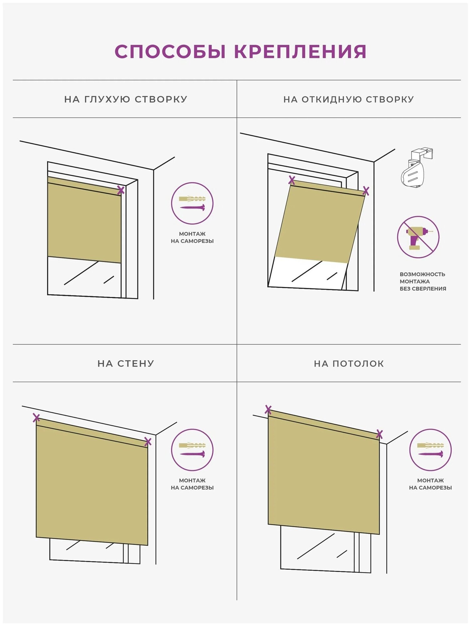 | Комплектация | рулонная штора в сборе, механизм в сборе (D17мм), пластиковая цепочка управления, крепление на откидную створку окна без сверления, инструкция по установке |