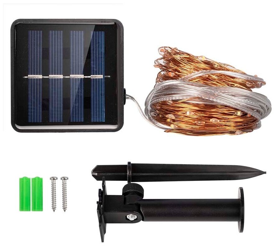 | Комплектация | светильник-гирлянда (светодиоды, солнечная батарея со встроенным аккумулятором), крепеж (два самореза и дюбеля) |