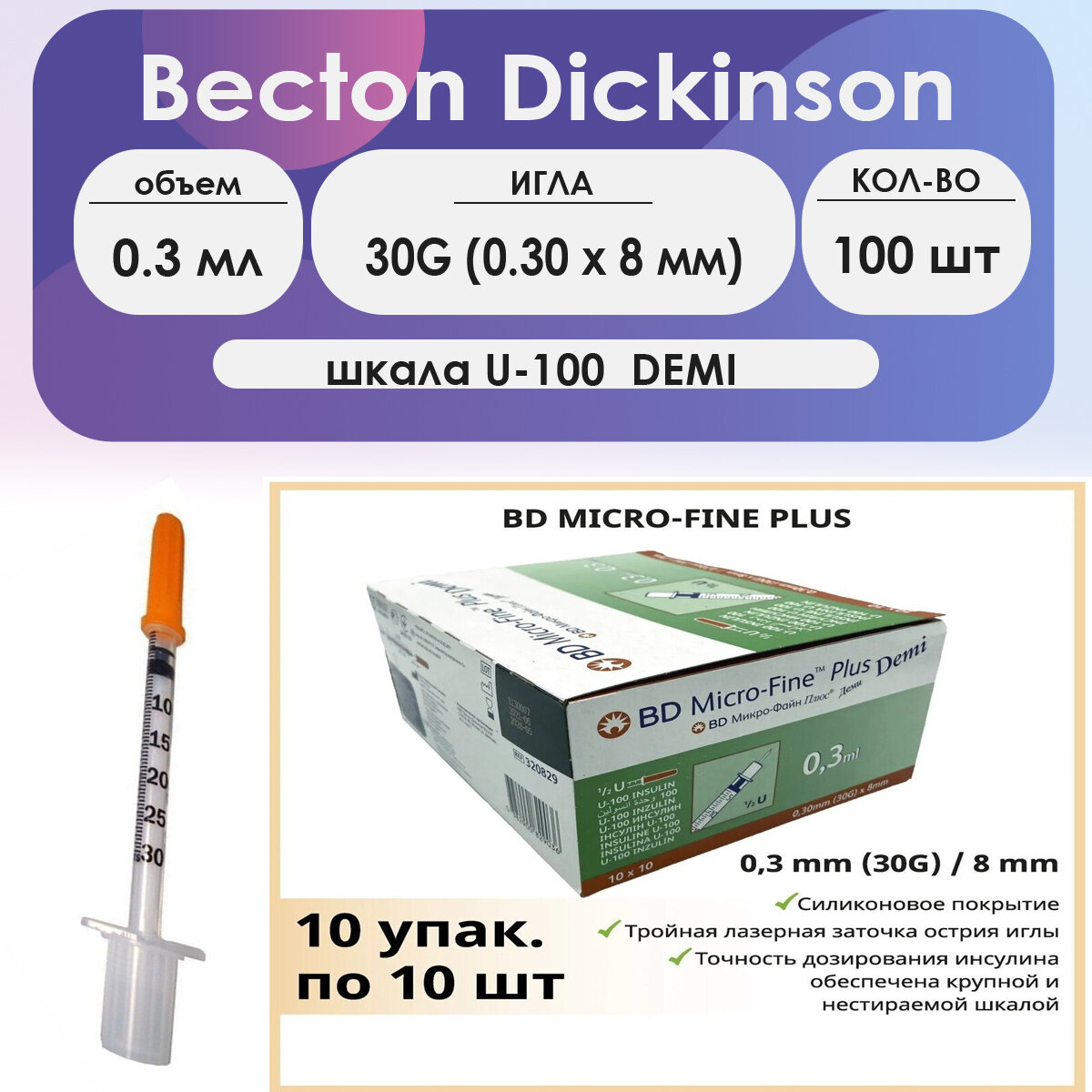 Шприц BD Micro-Fine Plus (3-комп.) 0,3 мл U100 интегрированная игла 30G (0,30X8,0) DEMI - 10шт комплект
