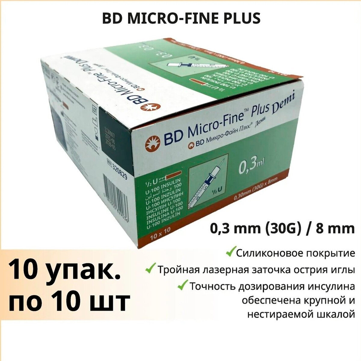 Шприц инсулиновый BD Micro-Fine Plus Demi 0,3 мл U-100 30G (0,3 мм x 8 мм), 10 шт