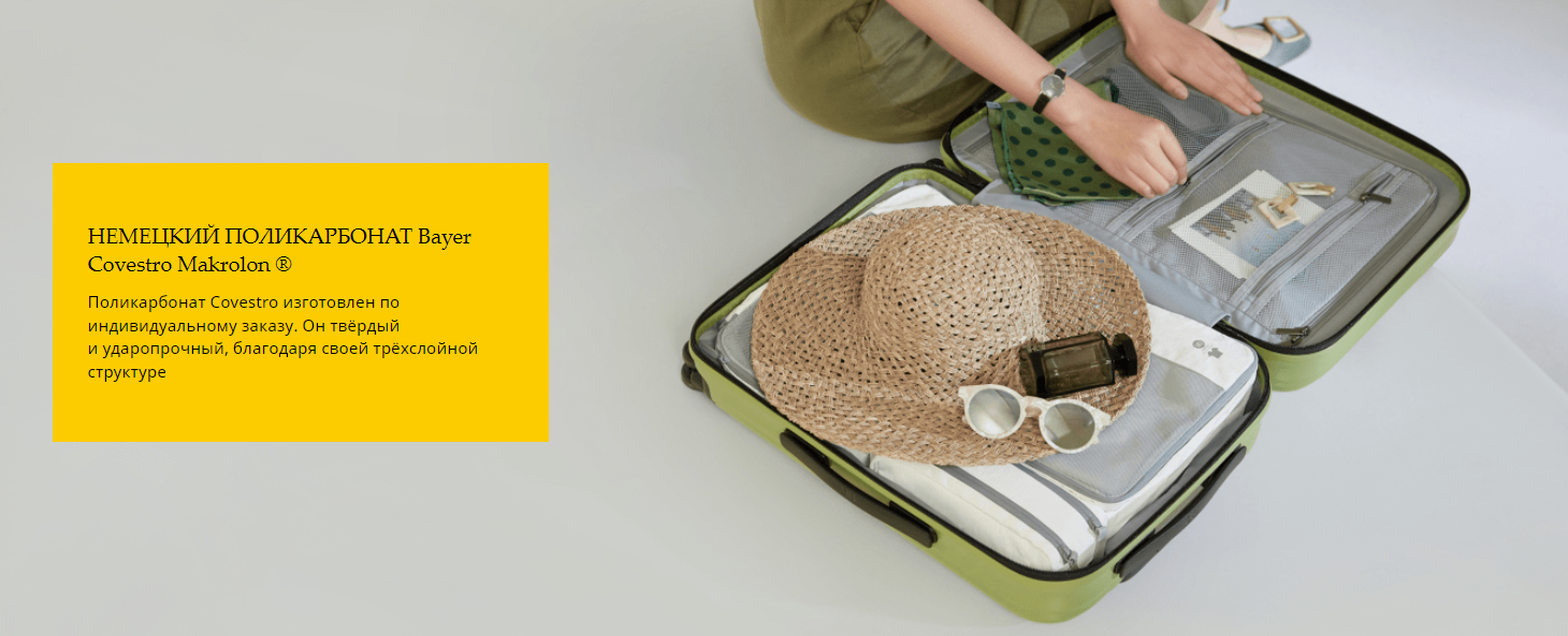 - красивый фисташковый цвет - крепкие колёсики - удобный разделительный клапан между отделами - не сильно царапается |