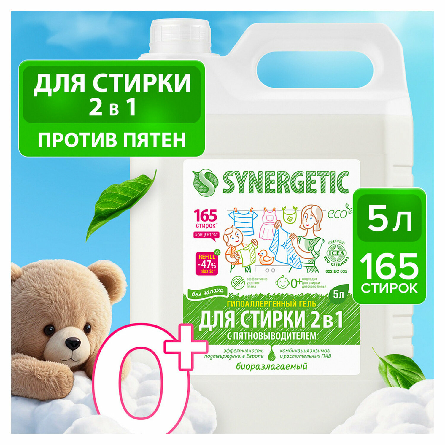 Гель для стирки SYNERGETIC с эффектом пятновыводителя, без запаха, гипоаллергенный, концентрат, 5 л