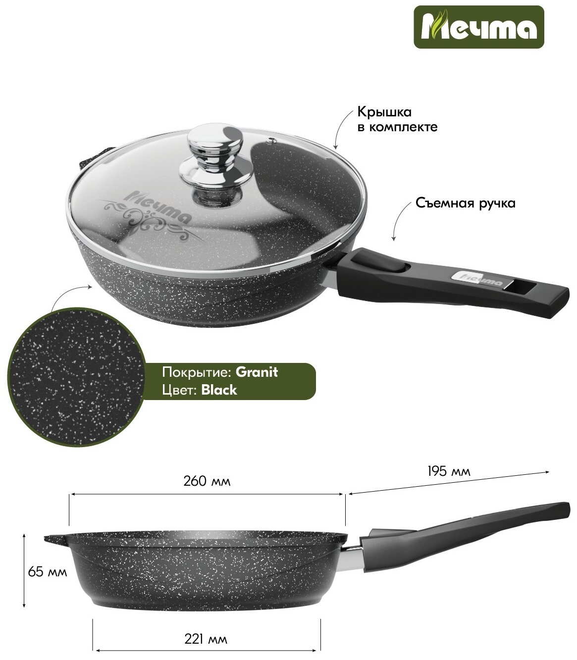Сковорода мечта посуда Мечта Гранит black со съемной ручкой и стеклянной крышкой, 26 см, арт. с026802