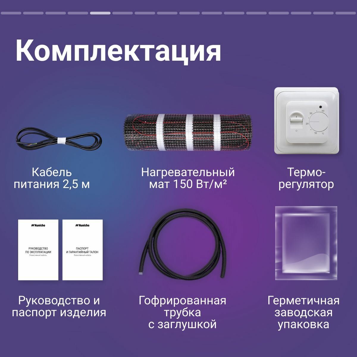 Теплый пол электрический под плитку 9 м2 Nunicho 150 Вт/м2 с терморегулятором механическим черным, нагревательный мат