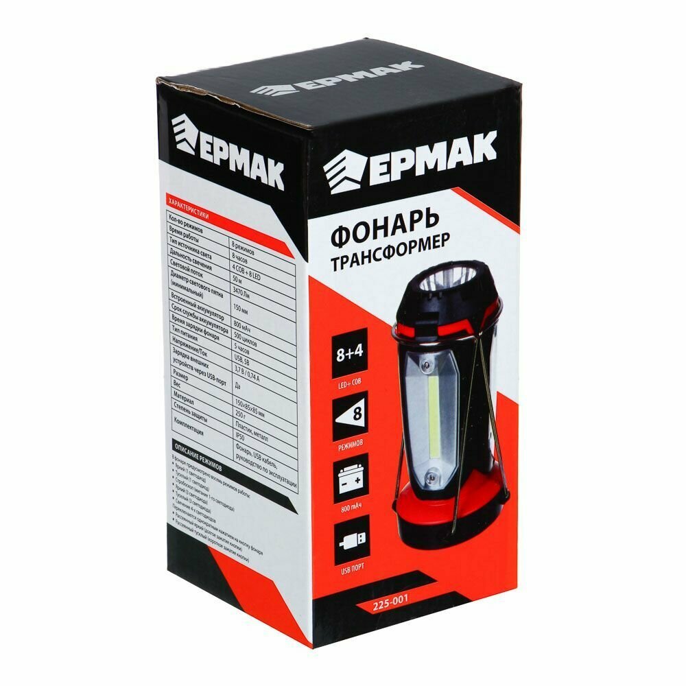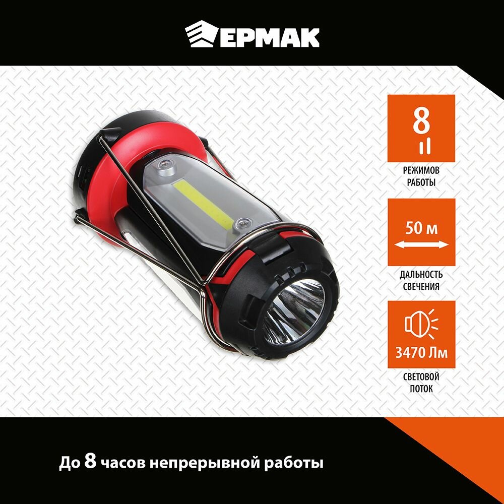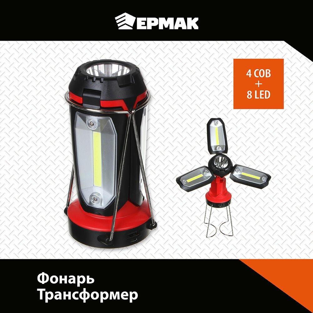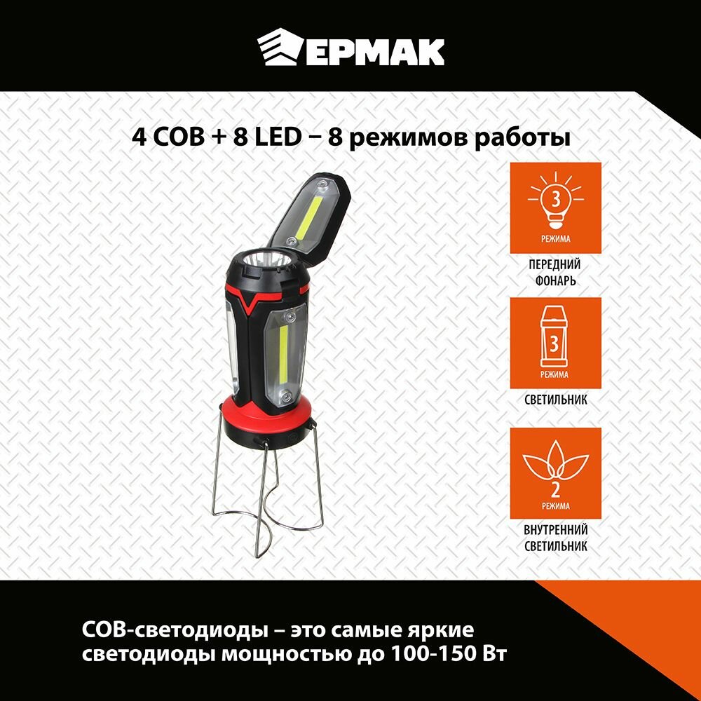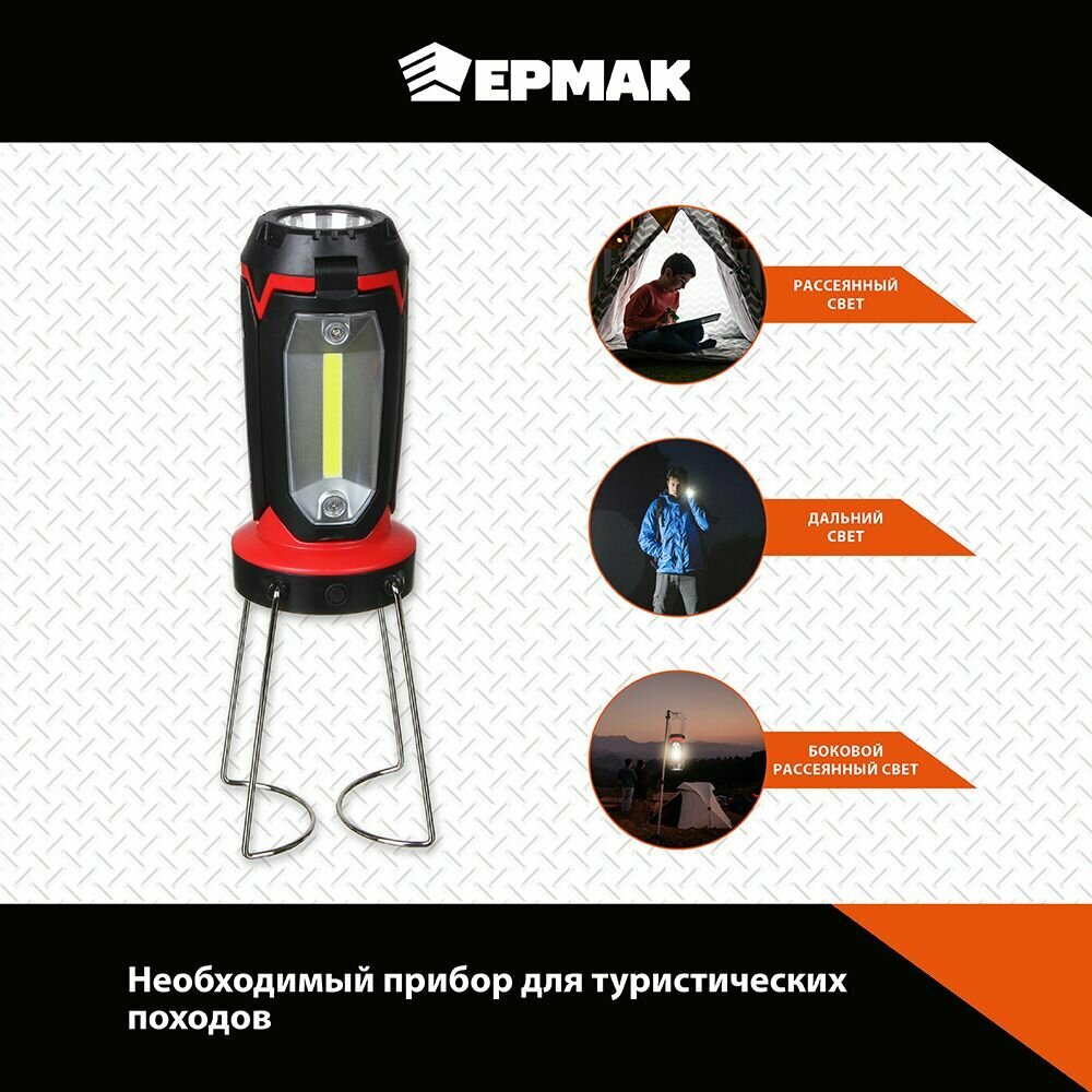 Ермак Фонарь светильник, 1 LED, 3 COB, 800мАч, USB, 15х8.5х8.5см, 6 режимов, пластик интересное: