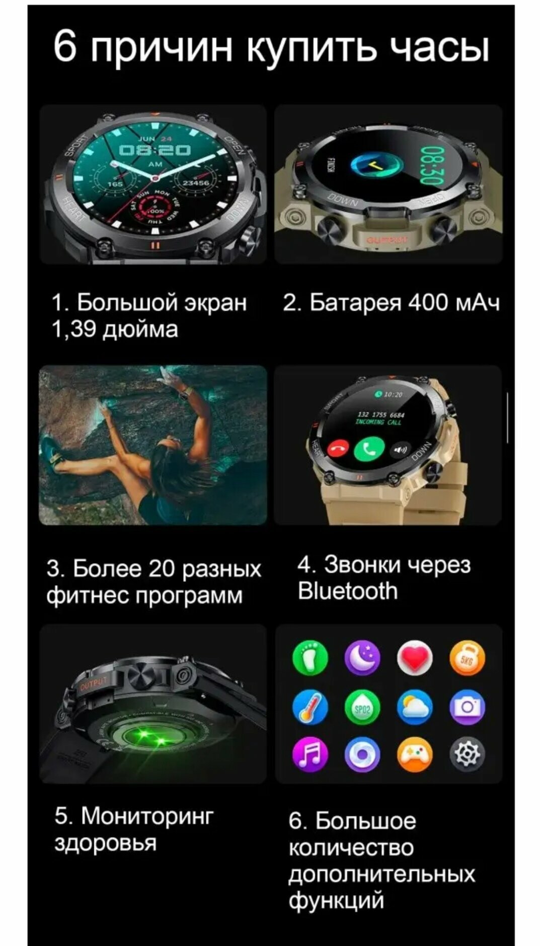 | Дополнительная информация | умное распознавание 8 видов спортивной нагрузки; более 150 встроенных спортивных режимов |