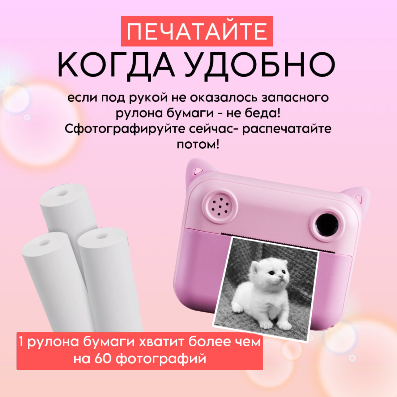 Детский фотоаппарат мгновенной печати розовый