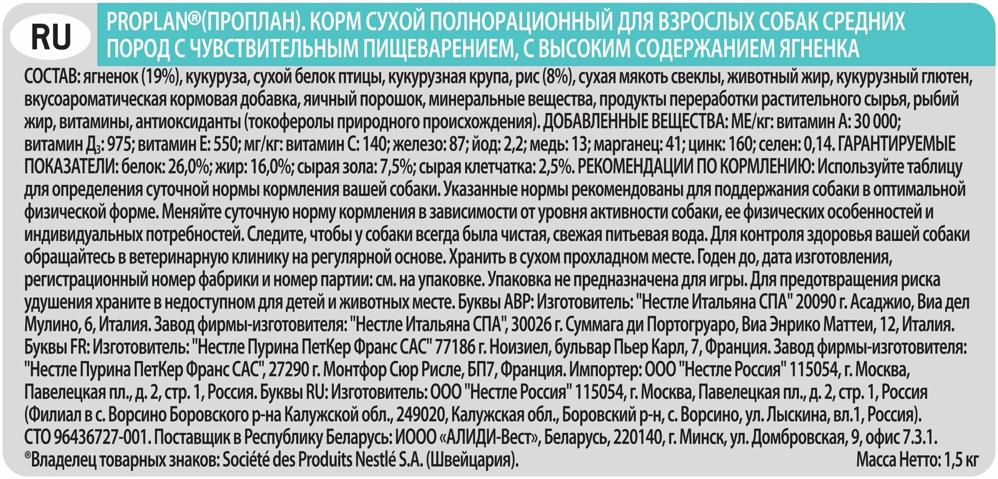Корм для собак ProPlan 1,5кг Adult Medium Sensitive Digestion д/взрослых/средних чувствительное пищеварение ягненок/рис 60399