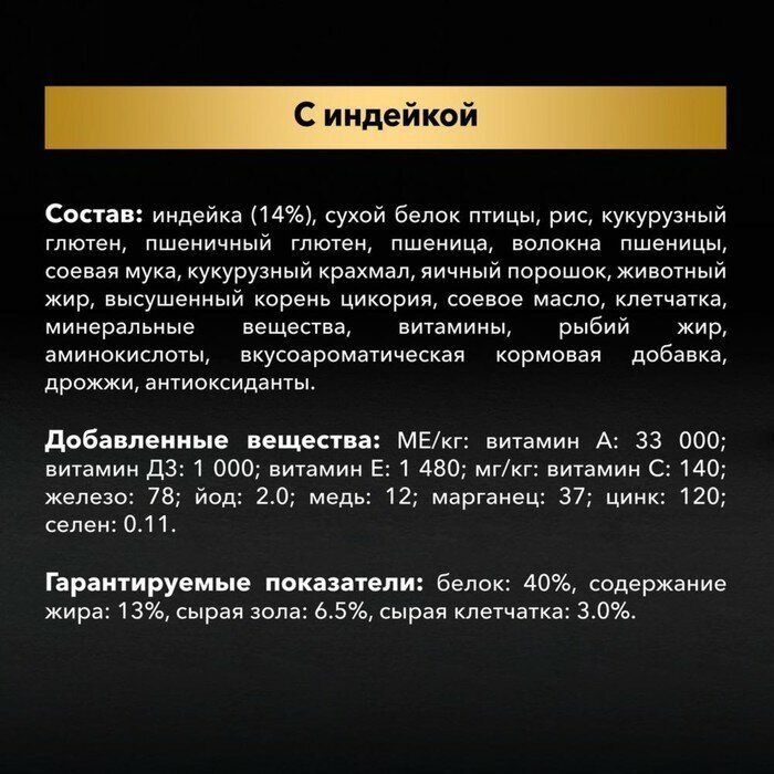 | Состав | индейка 14%, сухой белок птицы, рис, кукурузный глютен, пшеничный глютен, пшеница, волокна пшеницы, продукты переработки растительного сырья, кукурузный крахмал, яичный порошок, животный жир, рыбий жир, сухой корень цикория, масло соевое, минеральные вещества, витамины, рыбий жир, вкусоароматическая кормовая добавка, дрожжи, антиоксиданты |